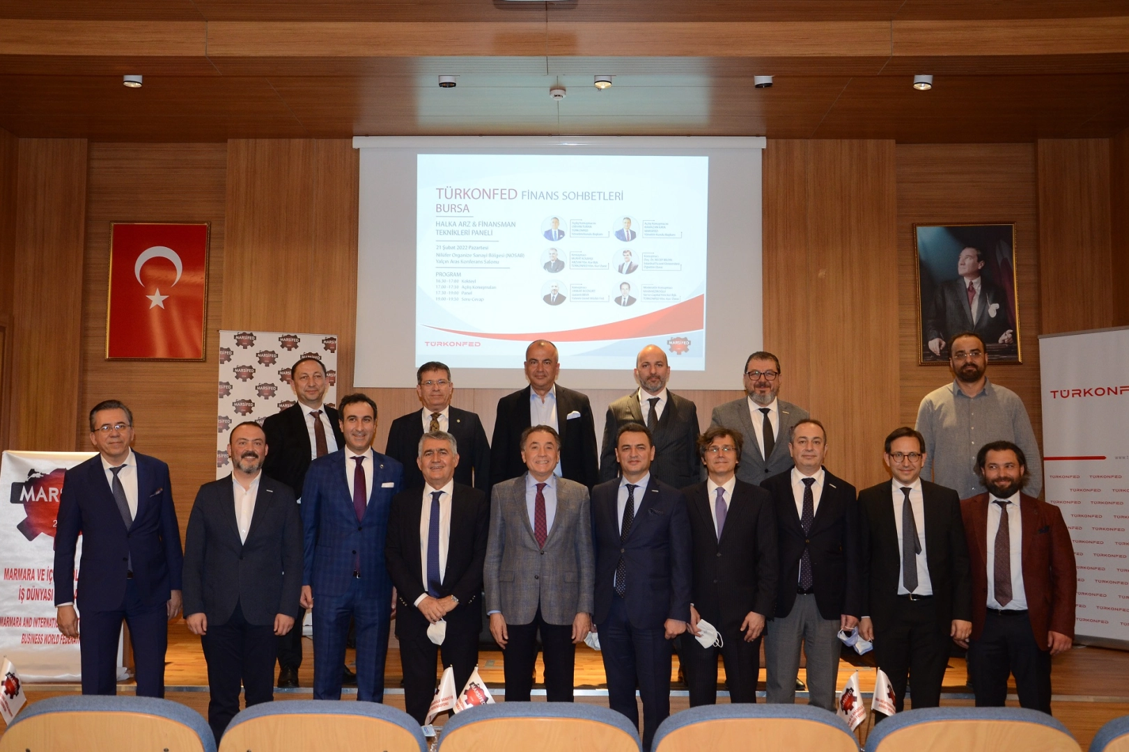 Nilüfer Organize Sanayi Bölgesi (NOSAB) Bölge Müdürlüğü Yalçın Aras Konferans Salonu’nda gerçekleştirilen Halka Arz ve Finansman Teknikleri ana temalı etkinliğin açılış konuşmaları, TÜRKONFED Yönetim Kurulu Başkanı Orhan Turan ve MARSİFED Yönetim Kurulu Başkanı Ramazan Kaya tarafından yapıldı.